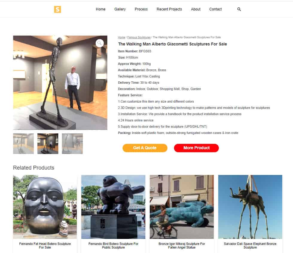 I got an unusual email the other day from an author who, while researching the 20th Century sculptor Alberto Giacometti, discovered that my 2019 blog post about a trip I took to the Vancouver (Canada) Art Museum where I photographed myself next to a Giacometti sculpture called “The Walking Man” had been stolen by a Chinese company for their website (see screenshot above) to sell their knock-off copies of famous sculptures. Do the famous artists or their estates know that this foreign company is making money from selling copies of their artwork or the legacy of their famous relatives? Should I feel insulted or flattered?